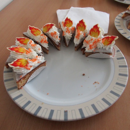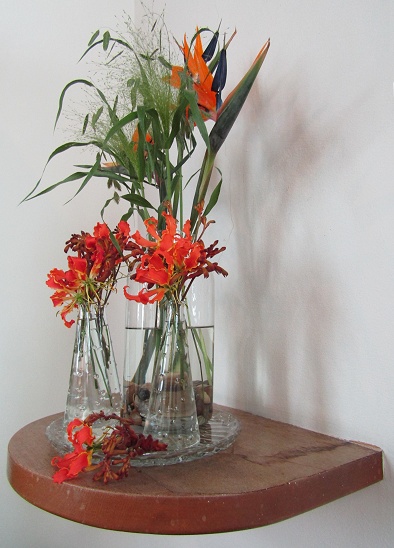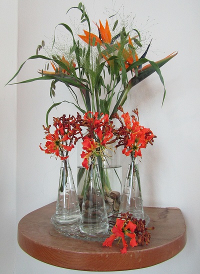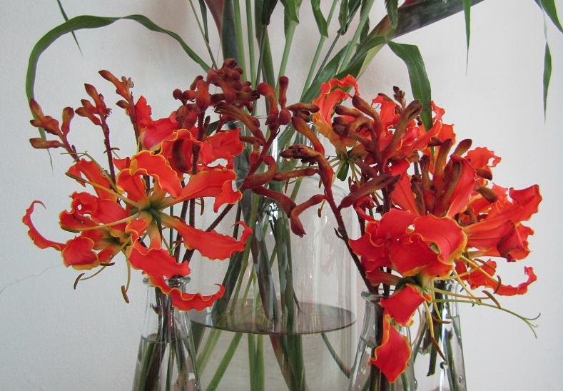 Met de Gloriosa-bloemen worden de vlammen prachtig uitgebeeld, maar ook de - overigens oranje - bloei van de Strelitzia bovenin lijkt wel wat op vuur.![]()