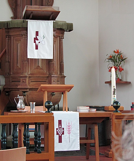 Er was een heel mooie bloemschikking gemaakt, in de liturgische kleur die bij Pinksteren hoort - rood.