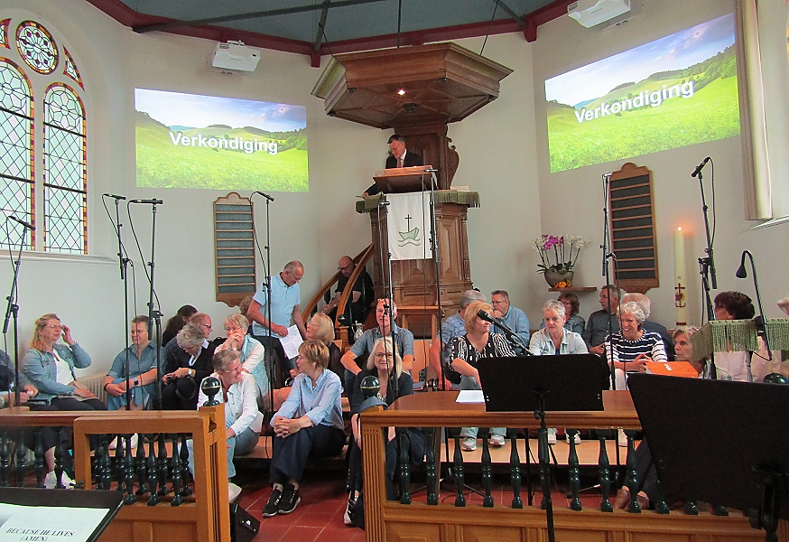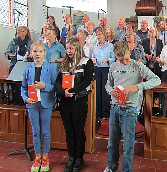De dienst werd muzikaal opgeluisterd door Gospelkoor 'De Regenboog' uit Dokkum, bestaande uit ongeveer 30 personen; ze vulden het hele liturgisch centrum van onze kerk, en zongen enthousiast en uitbundig, meest opwekkingsliederen, met begeleiding van dwarsfluit, drumstel en keyboard.