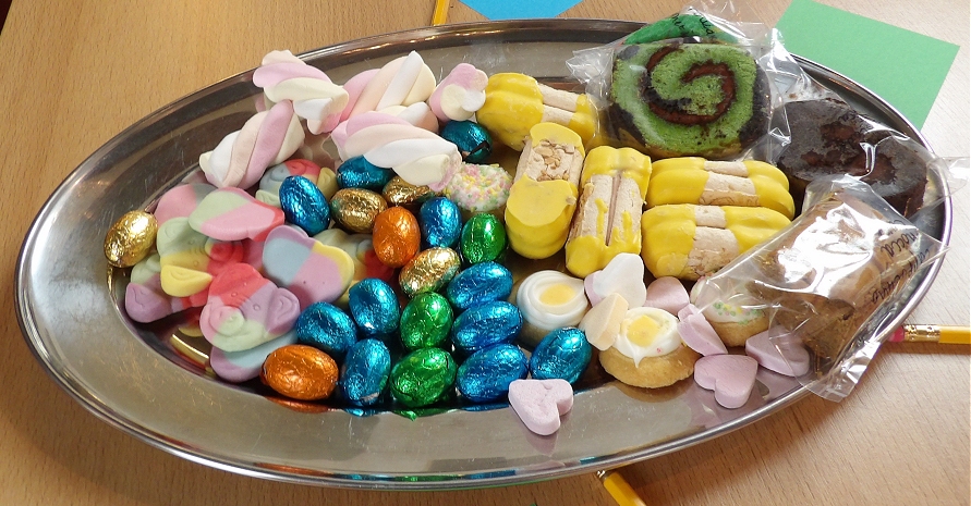 En bij zo'n speciale feestelijke dienst ontbrak ook de tractatie niet - de kinderen brachten allerlei lekkers rond, op elke tafel werd een schaal neergezet waar men het maar voor het uitkiezen had. Natuurlijk ook veel paaseitjes, al was het nog niet helemaal Pasen.