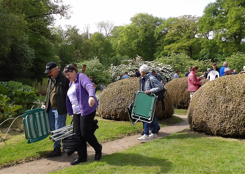 Na de dienst werden de stoeltjes weer ingeklapt en liep men naar de loodsen bij de volière voor een gezellige nazit met een kopje koffie, thee of limonade. Hoewel er veel moois in het Bos te zien was, bloemen en allemaal jong groen aan de bomen, zagen de Buxusbollen er treurig uit, die hebben de Buxusmottenplaag van 2023 niet overleefd.