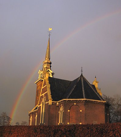Voor men de kerk binnenliep, was er iets heel bijzonders te zien, waar het op zich niet zo geweldig mooie weer alles mee te maken had: een schitterende regenboog. Al naar gelang waar men stond, zag men de kerk onder de boog, maar ook de begraafplaats eromheen, wat een bepaalde sensatie gaf van hoop, van een vooruitzicht op wederopstanding.