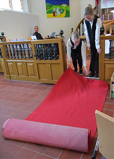 Ze rollen vervolgens een rode loper uit, waarover de keizer komt aanlopen en op zijn hoge troon gaat zitten (in dit geval de preekstoel).