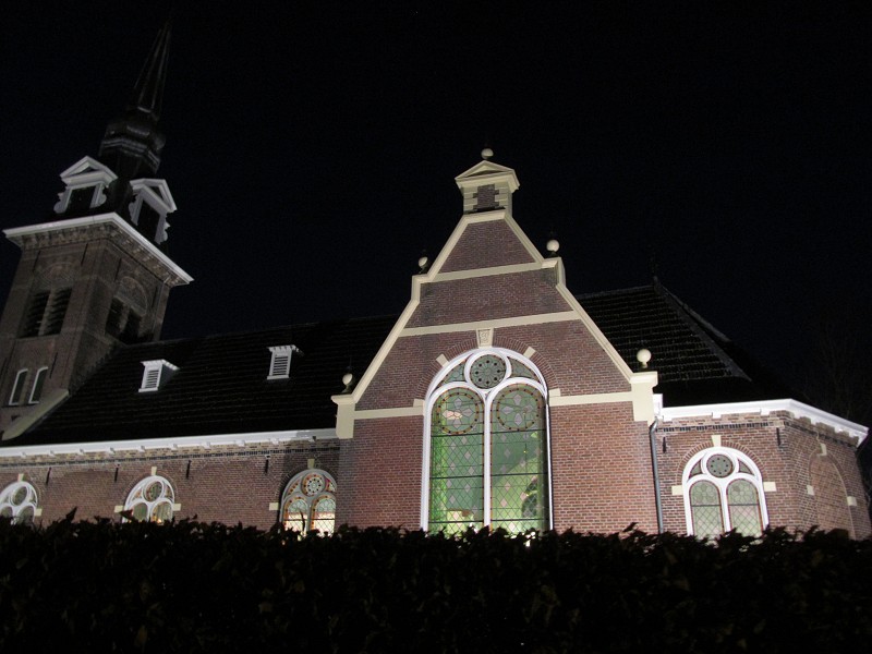 Hoeveel de opbrengst uiteindelijk is geworden, is me tot op heden echter onbekend. Het is de bedoeling daarvan led-verlichting rond de kerk aan te schaffen, maar bij deze gelegenheid was er ook al feestverlichting, langs het pad op het parkeerterrein en naar de ingang van de kerk, waar meer dan honderd waxinelichtjes in glazen potjes brandden, en de kerk werd van buiten met schijnwerpers verlicht. Vooral toen we tegen half zes vertrokken en het helemaal donker was, zag het kerkterrein er mooi uit met al die lichtjes.