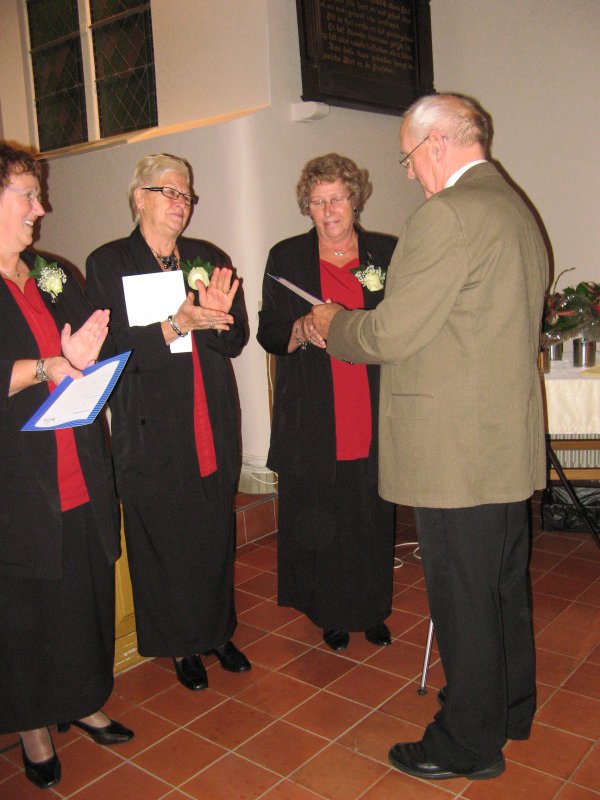 | Ook de dirigent, dhr. Henk Visser, werd gehuldigd. Hij heeft 15 jaar voor het koor gestaan, langer dan enige andere dirigent. |