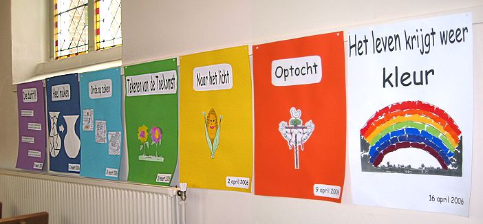 | Ieder plakte twee kleurtjes op de regenboog, en zie hieronder het resultaat, omhooggehouden door Hinke de Groot en Gjillie Katsma |