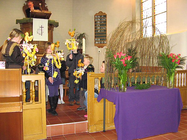 Van de "erehaag" van kinderen met hun palmpasenstokken langs het kerkpad kwam niet zoveel terecht,