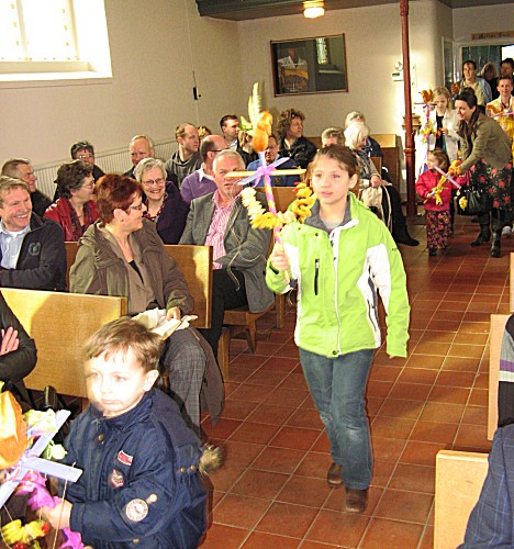 Tegen het eind van de dienst kwamen de kinderen binnen met de palmpasenstokken
