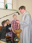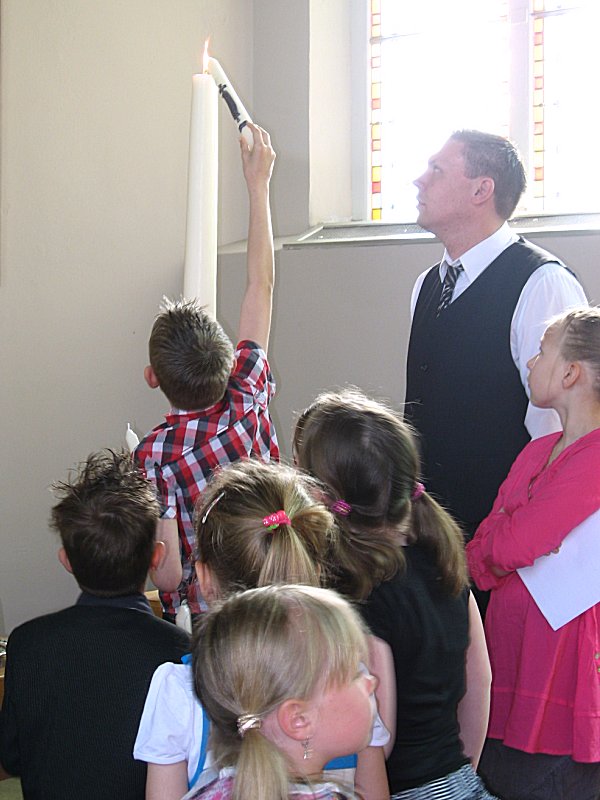 Na het dopen kregen ze ieder een doopkaars aangereikt, waarop staat: "Ik geloof". Deze mochten de jongens ook zelf aansteken aan de gloednieuwe Paaskaars, de vorige avond op Stille Zaterdag in de kerk geplaatst en voor 't eerst aangestoken.