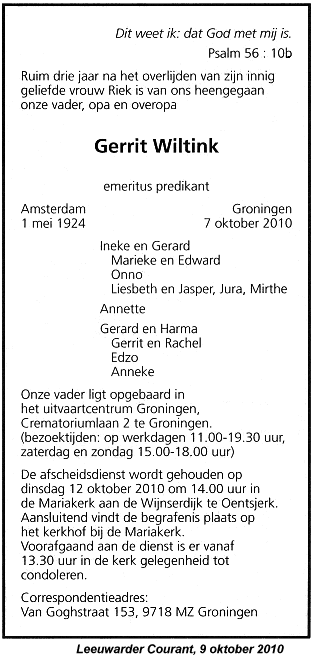 Ds. G. Wiltink overleden (7 oktober 2010)