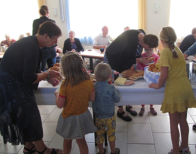 Zoals ieder jaar werd er op de Startzondag van het jeugdwerk een speciale dienst gehouden. Deze keer was er voordat die begon, om 10 uur een gezamenlijk ontbijt in de Sanjes, waar gelukkig aardig wat belangstelling voor was; de zaal zat vol mensen, en er waren ook veel kinderen bij. Het was een broodmaaltijd met o.a. heerlijke croissantjes.