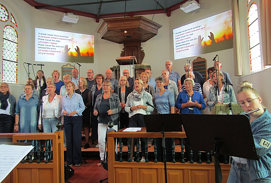 De dienst werd muzikaal opgeluisterd door Gospelkoor 'De Regenboog' uit Dokkum, bestaande uit ongeveer 30 personen; ze vulden het hele liturgisch centrum van onze kerk, en zongen enthousiast en uitbundig, meest opwekkingsliederen, met begeleiding van dwarsfluit, drumstel en keyboard.