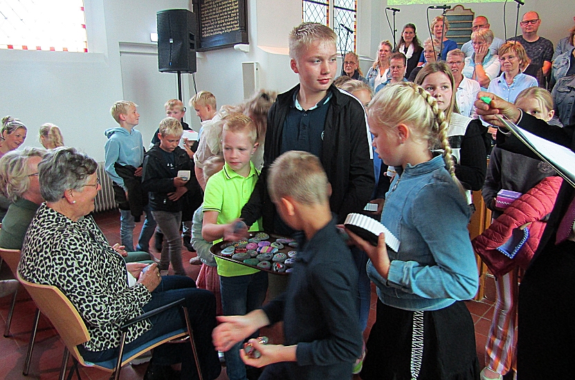 Na de preek kwamen de kinderen weer terug uit de kindernevendienst, waar ze een fotolijstje hadden gemaakt waar ze zelf iets in konden schrijven of plakken, en ook hadden ze steentjes beschilderd die ze uitdeelden aan mensen in de gemeente. Bij andere gelegenheden delen de kinderen vaak iets lekkers uit, maar dat hielden we nog tegoed want na de dienst was er in de Sanjes koffiedrinken, dan een spel en daarna nog een lunch, waar men zich vantevoren voor op had kunnen geven.